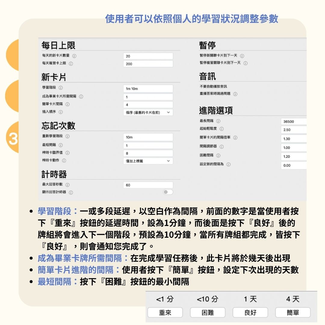 調整相關的參數(每日想練習的量、想重複的間隔)