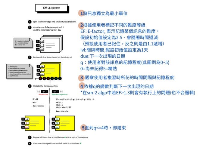 Anki 本身是基於 Super Memo 2 (SM-2) 演算法,透過自行設定的參數及對於資訊的記憶回饋,調整下一次出現的時間,進行間隔複習。在Anki演算法中,q 只有設定為4種方式,分別是『重來』、『困難』、『良好』、『簡單』。