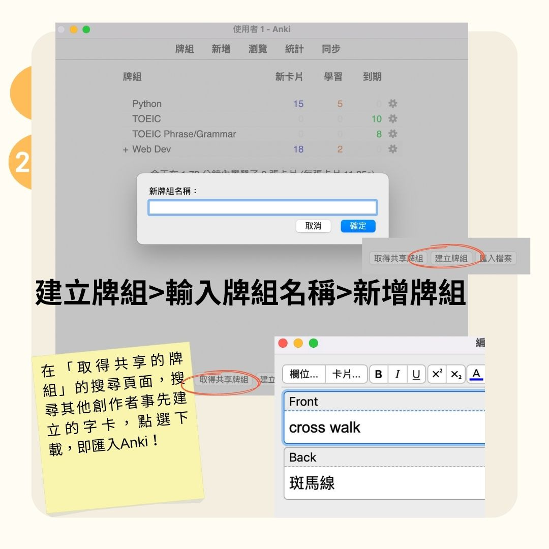 在軟體首頁點下面的「取得共享的牌組」的搜尋頁面,搜尋其他創作者事先建立的字卡,點選下載,即匯入Anki。